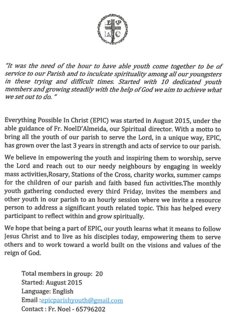 Christians in Kuwait Kuwait Menu The Chruch in Kuwait Introduction Frequently Asked Questions Historical Timeline Christians in kuwait Kuwait Parishes About the parishes Holy Family Co-Cathedral Parish Our Lady of Arabia Parish St. Thérèse Parish St. Daniel Comboni Parish Clergy / Religious The Bishop Bishops of Kuwait The Clergy / Religious Priests Who Served in Kuwait Rosary Sisters Apostolic Carmel Sisters Salesians of Don Bosco Mass Timings / Schedules Church Requirements Baptism / Pre-Baptism First Holy Communion Confirmation Matrimony Catechism Classes Marriage Preparation Course Parish Prayer Groups List of Prayer Groups Prayer Group Schedules Parish YOUTH Groups Young Adults in Christ: Weblog About (CFC) Youth For Christ EPIC-Abbasiya Youth Group Parish Announcements Contact Details YOUTH GROUP, KUWAIT